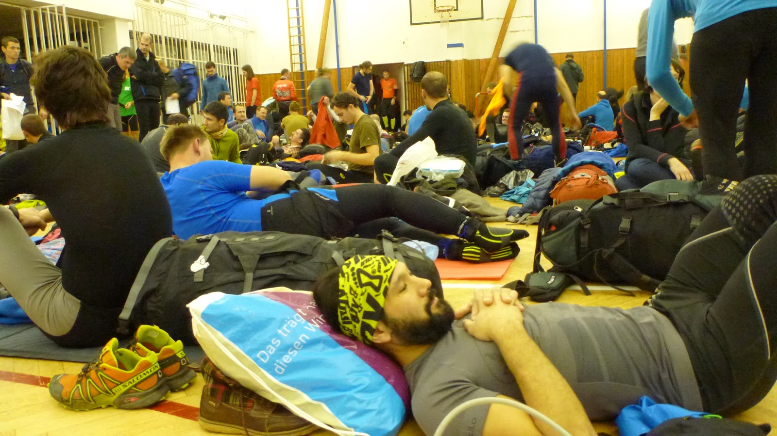 Po večeři se jedem do Modřan zaregistrovat. Rychlá převlíkačka v tělocvičně, pokec se všemi známými, na který se vždycky těším. Na P100 přijeli snad úplně všichni, dokonce i Petr z Roudnice, který už poslední roky nic jiného něž P100 neběhá a to jsme dříve běhali spolu vše. Všichni řeší co na sebe, protože podle předpovědi má v podstatě celou sobotu pršet. Nakonec na sebe hážu pouze 2 vrstvy: 200g letní merino s dlouhým rukávem a lehkou goráčovku s kapucí.